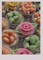 Almond paste together with sugar is molded into various delightful designs of flowers, small fruits, vegetables and animals. They are then hand painted with cheerful colors to create a reasonable imitation of the real object.